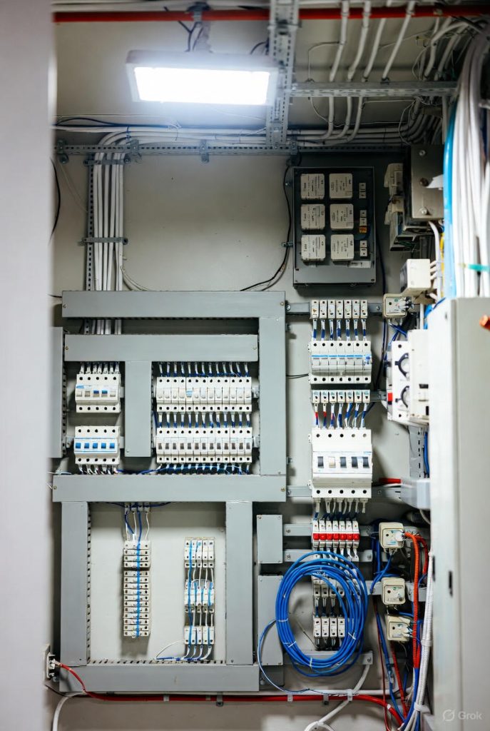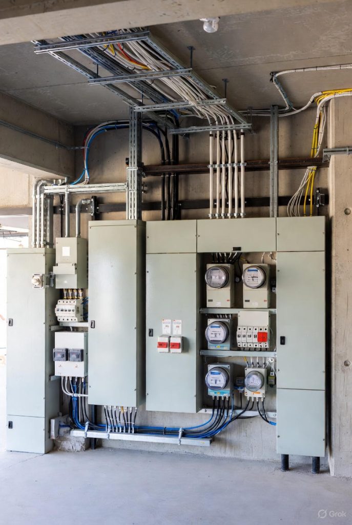 شامل سیم‌کشی برق، تابلو برق، روشنایی، سیستم‌های اعلام و اطفای حریق، دوربین مداربسته، و سیستم‌های هوشمند ساختمان می‌باشد.